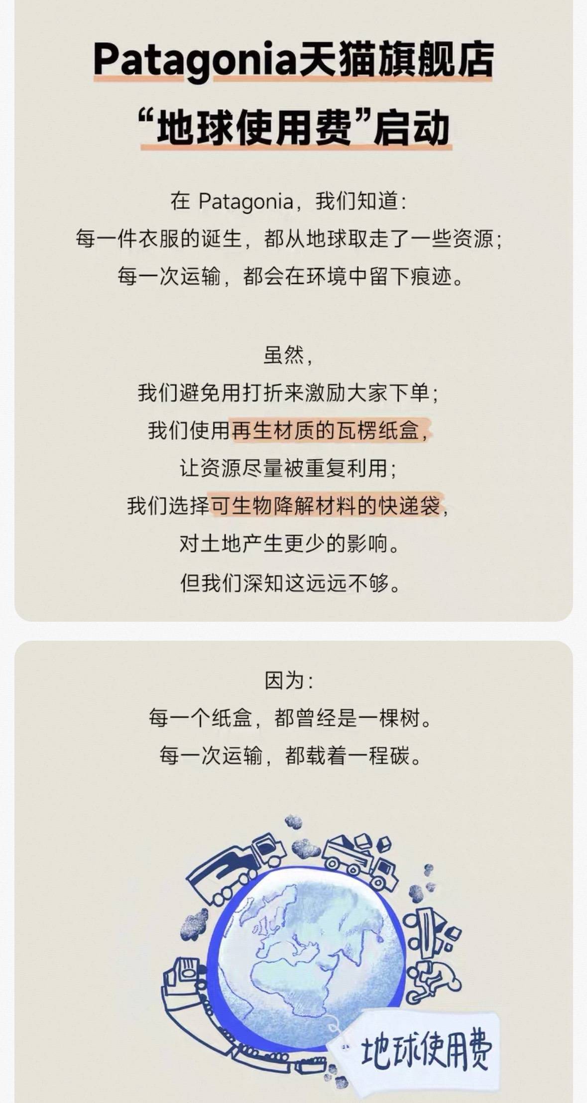 对此,巴塔哥尼亚天猫旗舰店客服回应:“这个(收取地球使用费)目前是咱们店铺牵头在做。”另外,记者了解到,该品牌线下店面尚未收取相关费用。