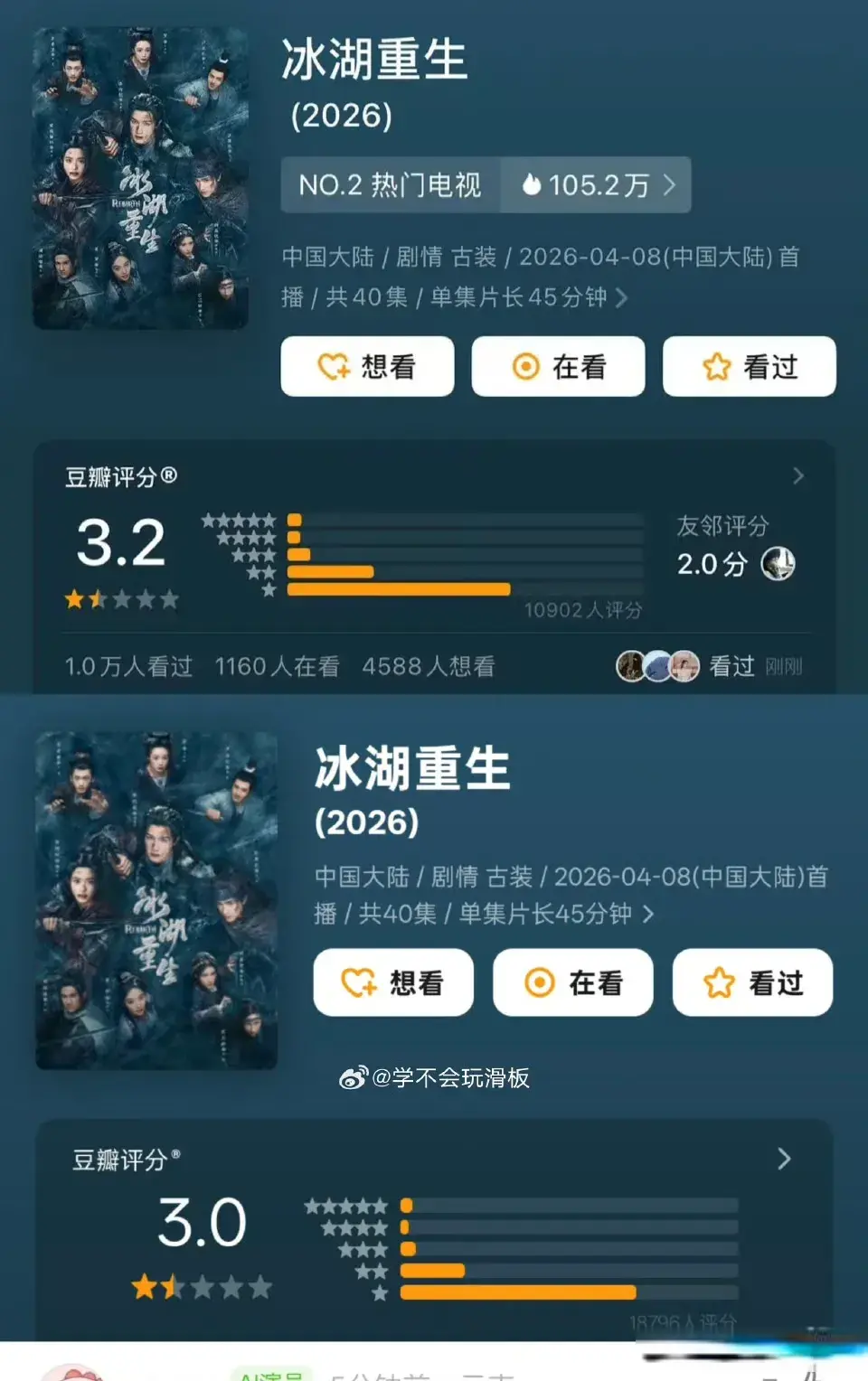 近期影视圈最荒唐的乐子,非李昀锐、黄杨钿甜主演的《冰湖重生》莫属。这部剧开播即翻车,全程被网友群嘲,豆瓣开分3.2本就惨不忍睹,如今直接暴跌至3.0,近一半观众毫不留情打出一星,差评铺天盖地,足以说明这部剧从剧情到制作全方位拉胯,彻底触怒了所有观众,烂得毫无争议。